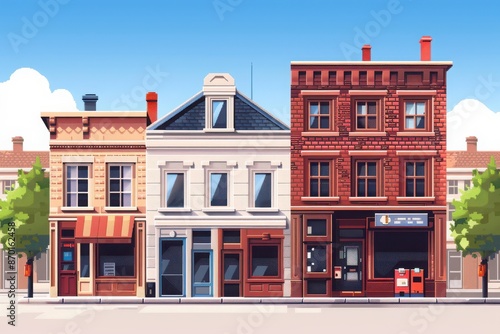 Charming row of historic downtown buildings with storefronts, clear blue sky, and trees lining the street, perfect for urban architectural themes.