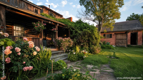 rustic, house, garden, rose, greenery, flower, sunlight, peaceful, architecture, nature, landscape, wooden, brick, pathway, summer, blooming, serene, bungalow, plant, vibrant, tranquil, residential, countryside, home, scenic, foliage, blossom, inviting, charming, rural, environment, exterior, warm, colourful, traditional, heritage, relaxing, picturesque, beautiful