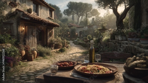 rustic, italian, village, pasta, olive oil, sunset, dining, table, cobbled, landscape, food, travel, culture, home, nature, garden, ambience, warm, sunlight, calmness, leisure, meal, traditional, culinary, herb, sauce, decor, beverage, glasses, vine, tree, architecture, pot, scene, inviting, cosy, picturesque, summer, country, festive, heritage, lifestyle, eat, relax, pastoral, view