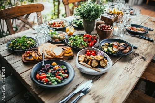 Charming rustic wooden table beautifully set with Mediterranean-inspired dishes and vibrant colors.