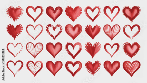Charming set of handcrafted red hearts with artistic watercolor textures and ink splatters, ideal for Valentine's Day, wedding invitations, greeting cards, and romantic marketing materials.