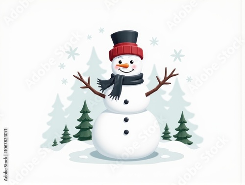 Charming Snowman Winter Illustration: Stylized Design for Seasonal Wear and Holiday Gifts. Minimalist Artwork Featuring Classic Snowman with Scarf and Top Hat in Festive Color Palette.