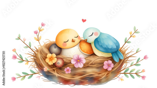 Charming soft watercolor illustration, sleeping birds in nest, whimsy, whimsical, suitable for children, pastel colors, vibrant flora and fauna colors. Generative AI