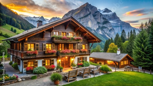 Charming Swiss Lodge: Rustic elegance, cozy ambiance, mountain views, warm colors, wooden accents