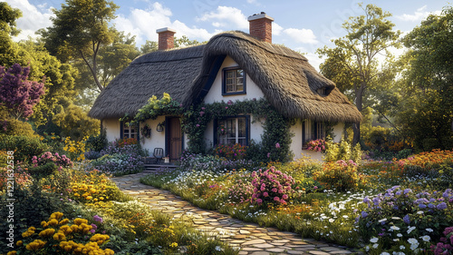 Charming Thatched Cottage Amidst a Vibrant Flower Garden