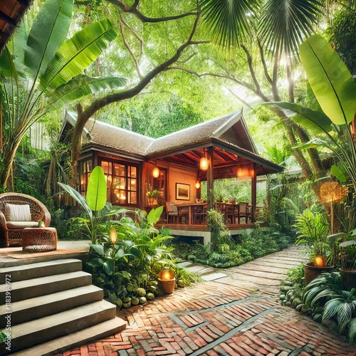 Charming tropical home for sale amidst lush greenery and brick pathway