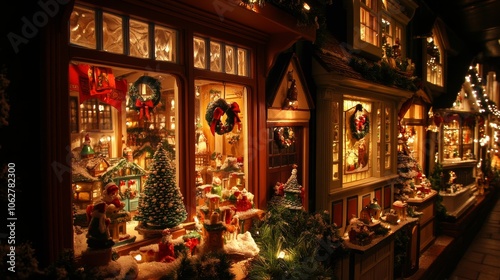 Charming Victorian English Village with Festive Decorated Windows Creating a Cozy Holiday Atmosphere