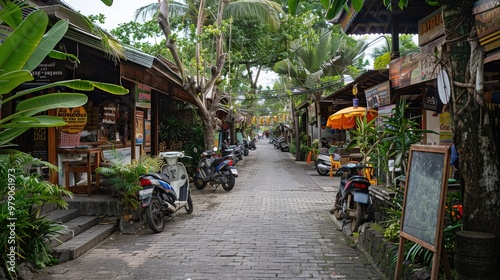 Charming Village Escape A Picturesque Cobblestone Street Lined with Colorful Shops and Lush Greenery