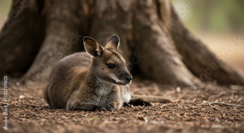 Charming Wallaby Portrait, A Gentle Creature Resting in the Shade near a tree