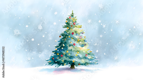 Charming watercolor christmas card design with decorated fir tree in soft pastel tones and falling snowflakes