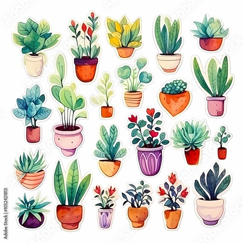 Charming watercolor plant stickers in various pots for decoration.