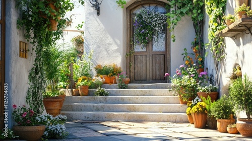 Charming white house entrance surrounded by vibrant plants and flowers on stone steps creating a welcoming outdoor atmosphere.