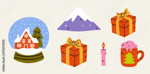 winter, snow, gift, mountain, snow globe, candle, festive, holiday, hand-drawn, cute, decoration, celebration, cheer, colourful, orange, snowflake, evergreen tree, cosy, winter scene, seasonal, present, mug, snow-capped, art, illustration, craft, gift wrapping, playful, creative, warm colors, nature, illustration, joyful, design, whimsy, charme