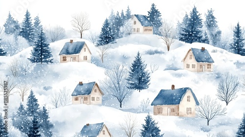 Charming Winter Watercolor Houses in a Snowy Landscape, Icy Blue and White Seamless Pattern with Snow-Dusted Roofs and Trees, Perfect for Seasonal Designs
