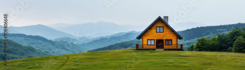 Charming wooden cabin on a grassy hill with panoramic mountain views under a serene sky, perfect for a peaceful retreat or nature getaway.