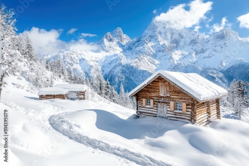 Charming wooden cabins nestled in a snowy landscape under a bright winter sky