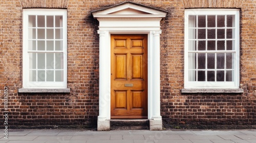 Charming Wooden Door Surrounded by Brick Wall and Windows