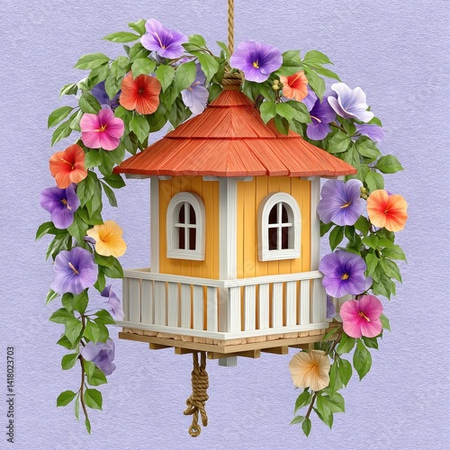 birdhouse, flower, hanging, yellow, orange, roof, purple, background, vibrant, colourful, floral, garden, home, decoration, spring, summer, cute, charming, rustic, detailed, craftsmanship, wooden, house, plant, pretty, aesthetic, art, illustration, design, vintage, whimsical, pastel, soft, nature, home decor, bird, wildlife, habitat, springtime, summer