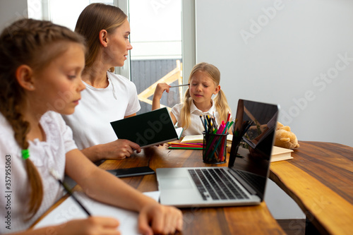 woman, mother, daughter, girl, young, adult, laptop, notebook, online, device, contraption, portable, display, keyboard, screen, home, wi-fi, cyberspace, modern, technology, caucasian, female, study, education, isolation, quarantine, children, children, childhood, mother, eltern, mother, parenthood, homework, maternity, schoolgirl, learning, table, write, book, cognition, sibling, sister, school, textbook