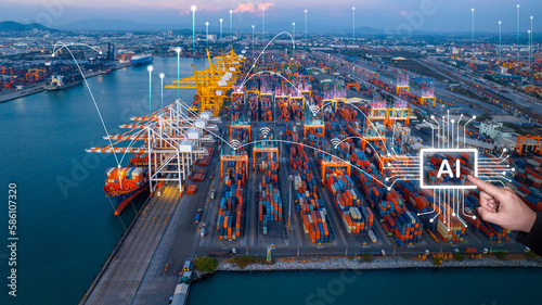 Chat AI bot. Ai tech for futurist automatic transportation logistics Cargo Shipping, business virtual graphic Global Internet line connect Chat with AI. hi technology in Ship port.