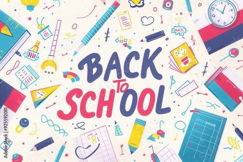 Checkered paper background with doodles, pencils, and books, "BACK TO SCHOOL" text, flat vector design..