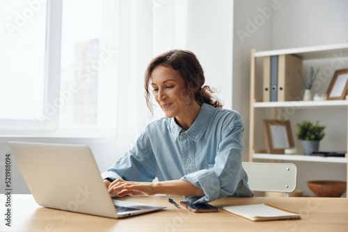 Cheerful adorable curly businesswoman worker freelancer chatting with client registers an order in social media in light office. Happy employee work on computer online in support service. Copy space