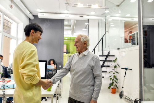 Cheerful aged man, senior intern shaking hands with young male colleague at his new job in the modern office