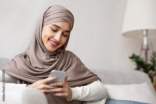 Cheerful arabic girl in hijab spending time with smartphone at home