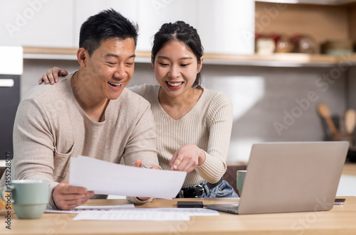 Cheerful asian spouses paying bills on Internet from home, sitting together at kitchen table, holding letters and papers, using computer and smiling, enjoying easy e-banking, copy space