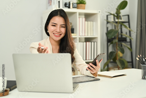 Cheerful asian woman worker holding mobile phone and communicating or online watching webinar on laptop