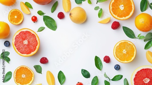 Cheerful assortment of vibrant fruits and green leaves against a white backdrop
