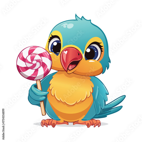 bird, parrot, lollipop, candy, sweet, treat, colourful, blue, yellow, red, pink, white, spiral, stick, beak, eye, wing, feather, claw, leg, orange, cartoon, happy, joy, pleasure, fun, cheerful, adorable, cute, illustration, graphic, design, artwork, style, character, image, isolated, background, eating, holding, smiling, face, looking, open, mouth, food, dessert, drawing