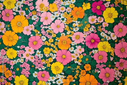 Cheerful background with colorful floral pattern. Features flowers in shades of pink, yellow and green.