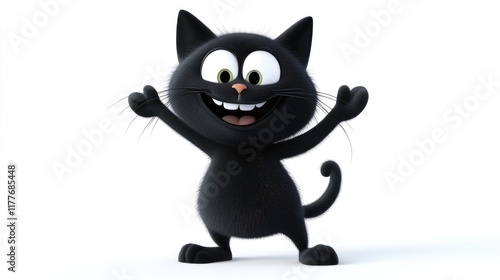 Cheerful black anthropomorphic cartoon cat posing playfully on white background suitable for children's media or pet-related content