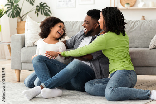 Cheerful black family having fun at home, parents tickling their daughter, laughing together, spending quarantine time in isolation, free space
