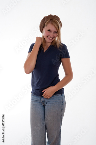 activity, adolescence, teenage, attractive, beautiful, beret, blond, blond, cap, casual attire, casual clothes, caucasian, cheerful, cut-out, cut-out, female, girl, girl, happiness, happy, hat, isolated, jean, people, person, positive, pretty, smile, smiling, studio, teenage, teenage, vertical, white, woman, woman