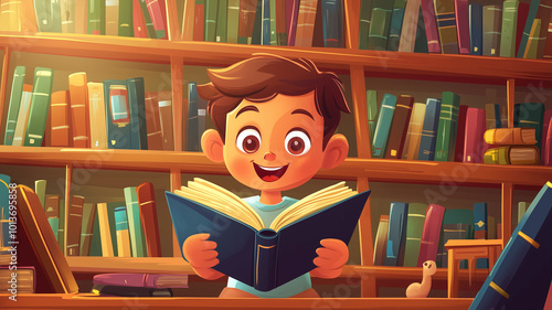 cheerful boy in a bright classroom library, surrounded by shelves of books, animatedly reading a storybook, cartoon vector illustration,