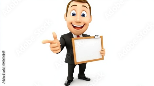 businessman, character, cartoon, cheerful, pointing, suit, smile, professional, board, white, happy, expression, isolated, studio, advertising, presentation, concept, announcement, promotion, marketing, communication, gesture, idea, creativity, office, friendly, male, design, graphic, fun, humor, social, agent, illustration, manager, adviser, showcase, layout, signs, template, person, active, confident, creative