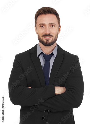 adult, business, businessman, cheerful, confidence, photogenic, happiness, man, people, portrait, smiling, standing, suit, adults only, businessperson, button down shirt, casual clothes, cut-out, elegance, expertise, facial expression, joy, loyalty, male, one man only, one person, photo, pride, professional occupation, relaxation, satisfaction, shirt, studio shot, toothy smile, vertical, white background, young adult, young men