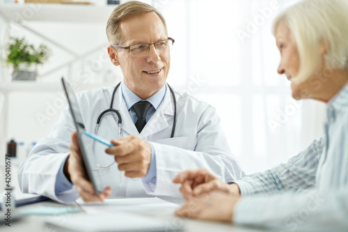 doctor, patient, medicine, hospital, adult, medicals, clinic, appointment, man, woman, consultation, tablet, computer, digital, portable, display, screen, modern, technology, device, contraption, electronic, female, male, treatment, health, health care, disease, disease, old, elderly, pensioner, caucasian, physician, office, specialist, professional, stethoscope, diagnosis, cyberspace, online, cheerful, joyful, smile, positive, smiling