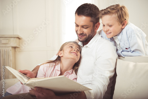 cheerful father reading book to his daughter and son while sitting on sofa
