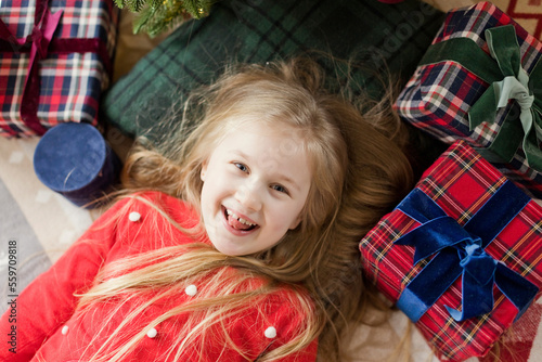 Cheerful girl lying on rug with Christmas gifts at home