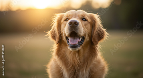 Cheerful golden retriever puppy with open mouth enjoys a stunning sunset glow in a field, capturing pure joy and playful canine spirit