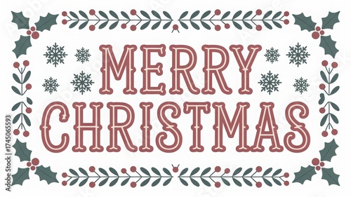Cheerful Hand-Drawn Merry Christmas Stamp with Holly Berry and Snowflake Border for Festive Greetings