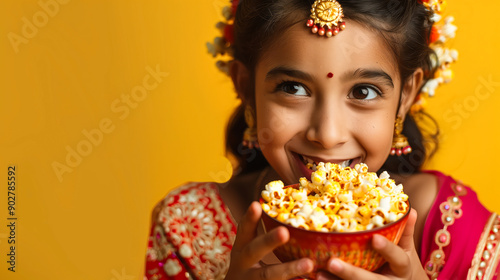 Cheerful Indian girl wearing traditional dress, eating popcorn