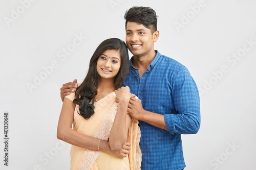 adult, adults only, affectionate, beautiful woman, beauty, bonding, boyfriend, charming, cheerful, female, friendship, girlfriend, happiness, holding, horizontal, india, indian culture, joy, laughing, lifestyle, male, man, people, photo, portrait, relaxation, saree, smiling, standing, studio shot, togetherness, toothy smile, two people, oneness, white background, woman, young adult, young couple, young men