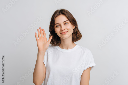 cheerful, individual, displaying, friendly, greeting, gesture, warm, smile, standing, against, clean, background, radiating, positivity, person, expression, filled, joy, making, experiencing, inviting, genuine, hand, raised, classic, wave, sense, connection, openness, scene, essence, friendship, goodwill, encouraging, other, engage, confidence, warmth, comfort