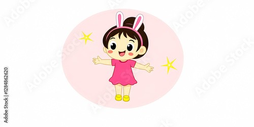 girl, rabbit, ear, dress, headband, pink, yellow, star, happy, cheerful, cute, smiling, playful, whimsical, joyful, positive, adorable, sweet, charming, delightful, children, toddler, children, cartoon, background, fun, celebration, joy, blithe, innocent, magical, bright, childhood, playtime