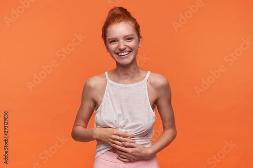 Cheerful lovely young lady with foxy hair combed in bun wearing white top, standing over orange background with hands on her body, smiling to camera widely