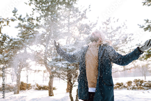 Cheerful man enjoying a cold snowy day. Stylish man spends time outdoors. Season, Christmas, travel.